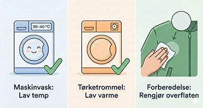 Følg alltid plaggets vaskeanvisning. Vanligvis innebærer det lav temperatur (30–40 °C), ingen tøymykner og et mildt vaskemiddel. Unngå å overfylle maskinen. Følges vaskeanvisningen, sitter reparasjonen normalt på plass også etter vask.
