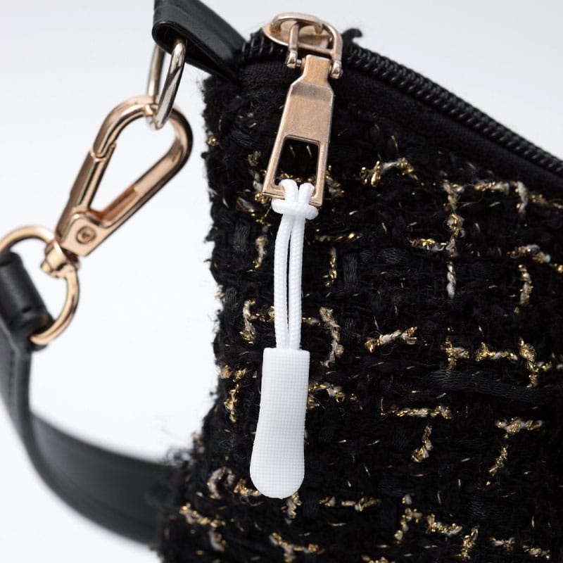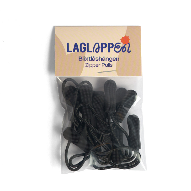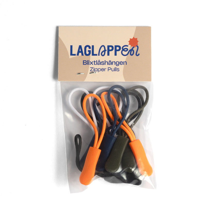 Pakke med stilige premiumanheng for glidelås i flere farger. Hvert glidelåsanheng (zipper puller) er i et fleksibelt materiale som ligner gummi. Det er knudrete overflate på anhenget, som gjør det lett å få tak i selv om fingrene er våte. Designet er litt s-formet slik at du får grep selv når fingrene er nedkjølte eller hvis du har vantene på deg. Snoren er i polyester.