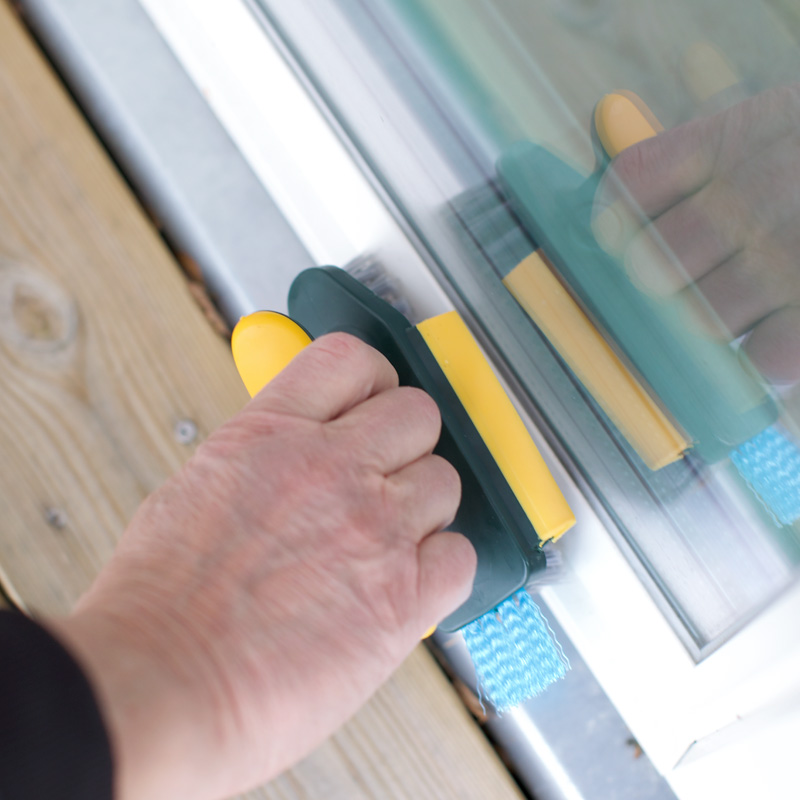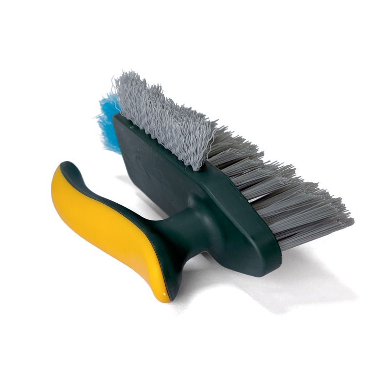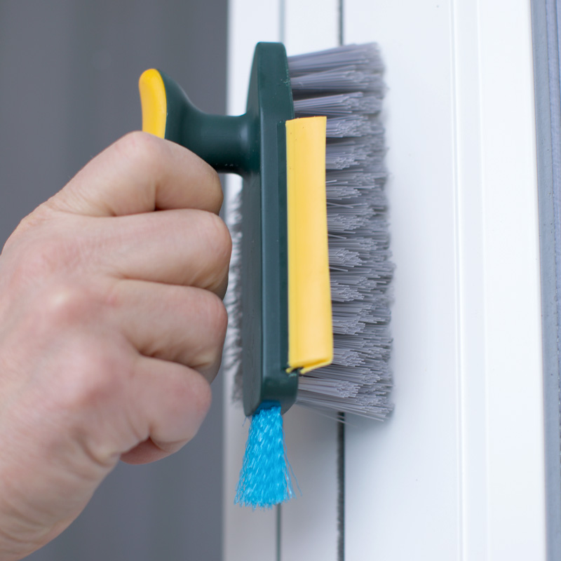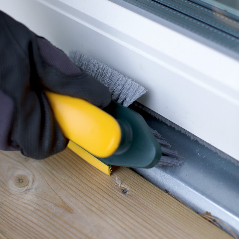 Denne multibørsten er laget for nettopp disse situasjonene. Formen gir et stødig grep, noe som gjør det lett å jobbe kontrollert selv når man må ta i litt. Busten er kraftig nok til å fjerne gjenstridig smuss, samtidig som børsten er smal nok for eksempelvis spor i altandører, garderobedører, rundt kraner og langs lister.
